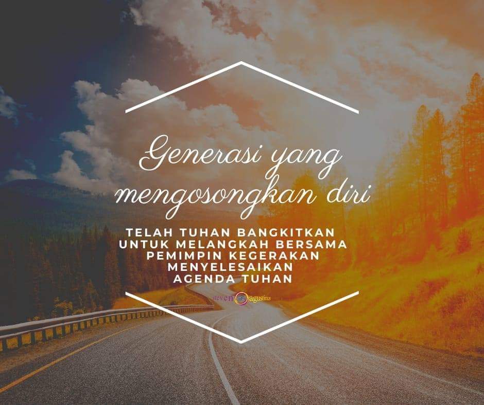 Generasi inilah yang akan menyatu dengan pemimpin kegerakan yang Tuhan tetapkan (berjalan dalam ikatan janji) dan menyelesaikan agenda-Nya sampai tuntas di atas muka bumi. Oleh kedaulatan-Nya Ia telah membangkitkan pemimpin kegerakan, oleh kedaulatan-Nya juga Ia telah membangkitkan generasi yang mengosongkan diri sama seperti Kristus (Filipi 2).
